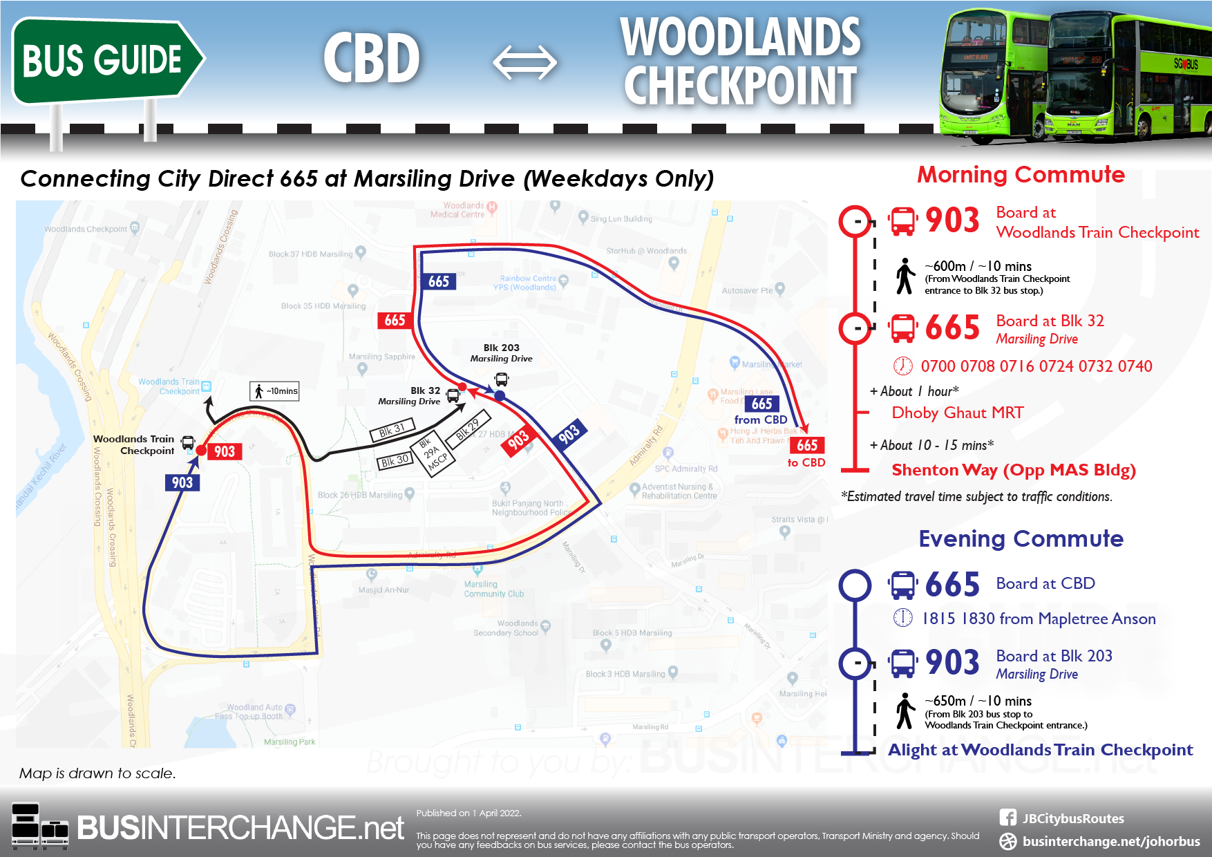 If you are exploring on taking the bus from Singapore's Central Business District, City Direct 665 provides direct connection from Tanjong Pagar, Raffles Place and Dhoby Ghaut to Marsiling Drive. Marsiling Drive is about 10 minutes walk from the Woodlands Checkpoint. You may also consider boarding bus 903 to connect directly to Woodlands Train Checkpoint.