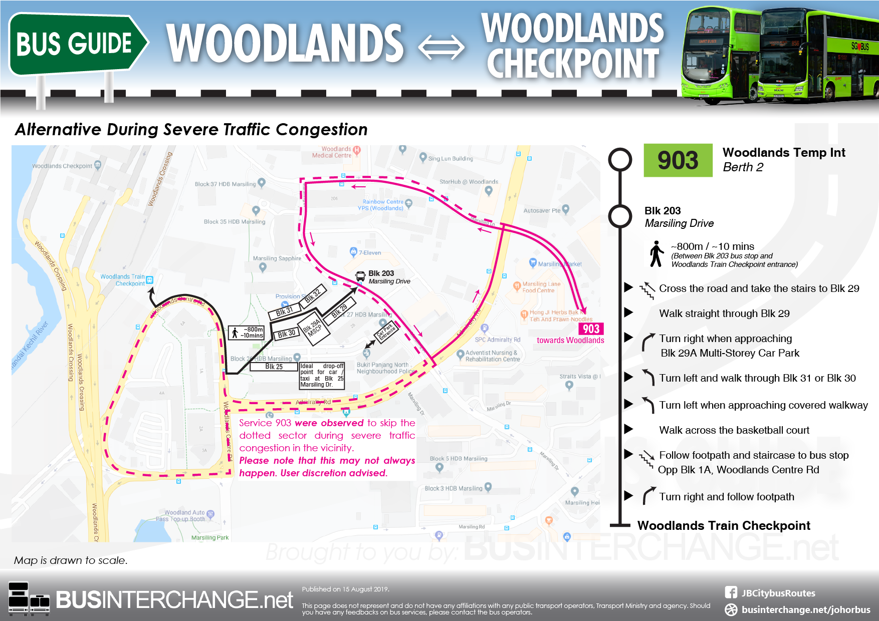Occasionally, bus service 903 were observed to loop back from Marsiling Drive and skip Woodlands Train Checkpoint during congestion. As such, buses can continue to run Service 903 without being affected by the congestion. However, please note that this arrangement may not always happen.